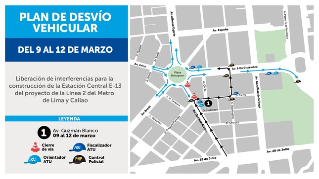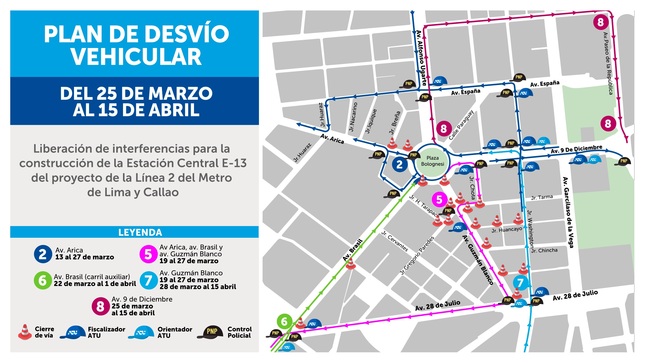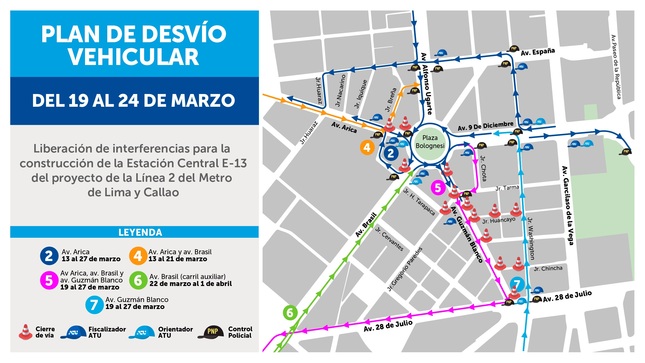 El Ministerio de Transportes y Comunicaciones (MTC) y la Autoridad de Transporte Urbano para Lima y Callao (ATU) anunciaron que a partir del miércoles 9 de marzo se pondrá en marcha un primer plan de desvíos vehiculares en los alrededores de la Plaza Bolognesi y el Paseo Colón. Esto con el fin de continuar con el proyecto de la Línea 2 del Metro de Lima y Callao.