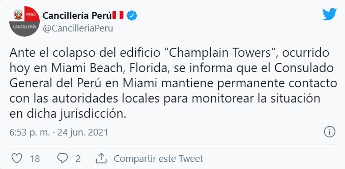 La Cancillaría peruana informó por Twitter que hasta el momento no existe niguna víctima peruana tras el derrumbe del edificio Champlain Towers, ocurrido hoy en Miami Beach (Estados Unidos).