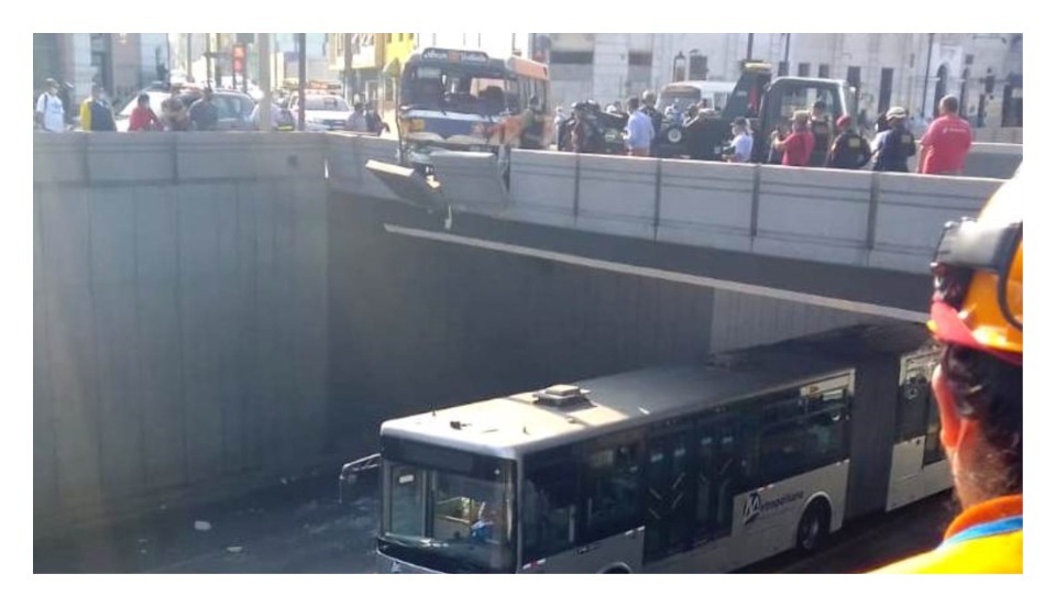 Esta mañana, una cúster de transporte de pasajeros que cubre la ruta Ancón - Ventanilla chocó y dañó la estructura de un puente ubicado en la avenida Alfonso Ugarte, a una cuadra de la plaza Dos de Mayo, en el Cercado de Lima.