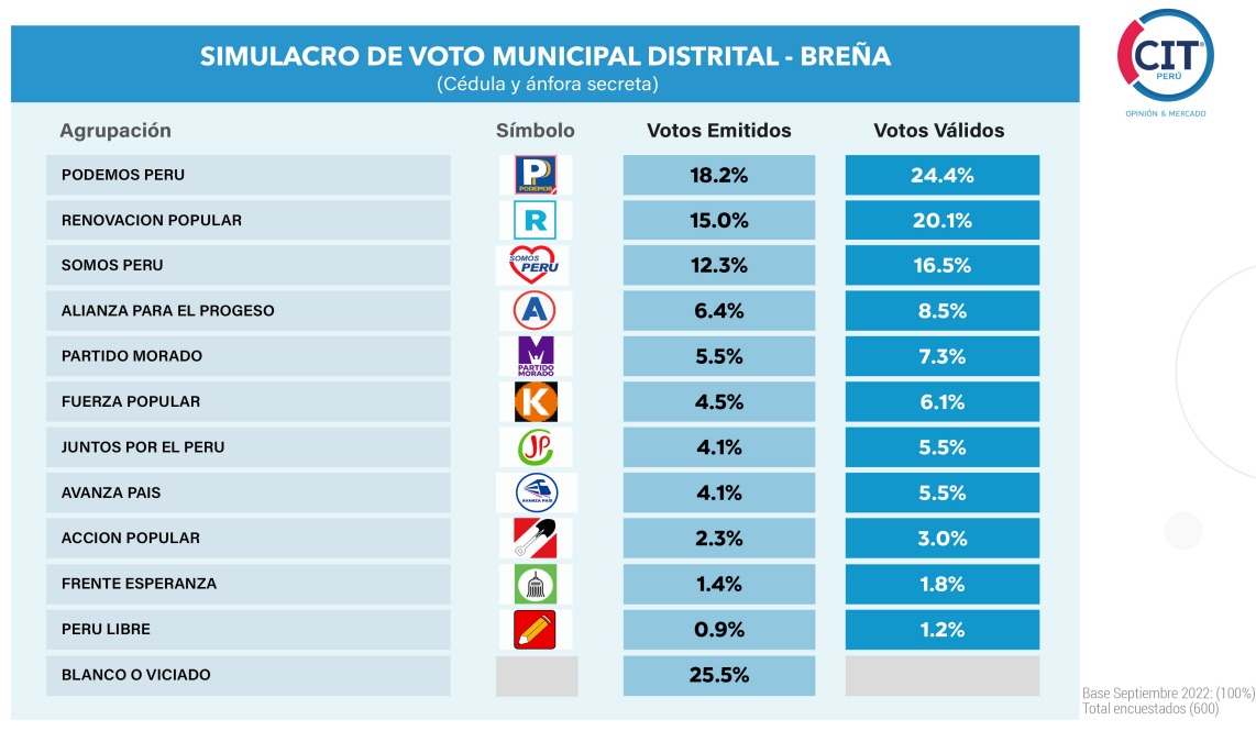 A una semana de las Elecciones Municipales 2022, según la última encuesta realizada por CIT Perú, que además realizó simulacros de votación y consultas para conocer qué candidatos son los preferidos en algunos distritos de Lima Metropolitana y Lima Norte, arrojó que un 56% de limeños señala que ya tiene decidido su voto. Para Lima Metropolitanana el partido de Podemos Perú y el de Renovación Popular son los fuertes candidatos para llegar al sillón municipal.