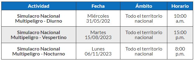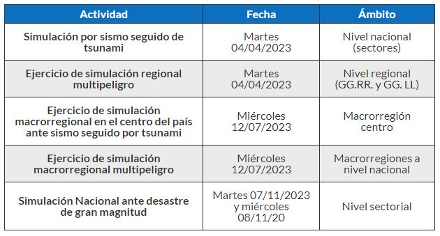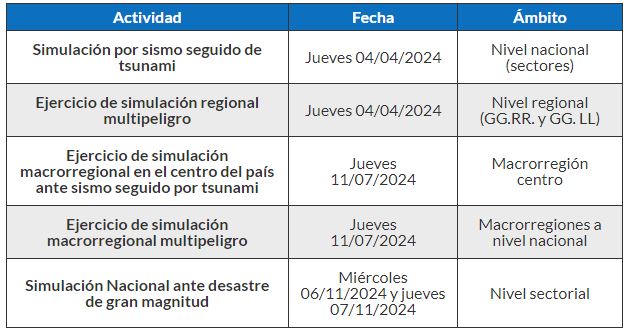 Bajo el contexto de pandemia por Covid-19, el Gobierno viene realizando un cronograma de ejecución de los simulacros y simulaciones por sismos, tsunamis y multipeligro para los años 2022 al 2024 en el Perú. Cabe mencionar que esto tiene una metodología distinta que no implica evacuación ni contacto físico.