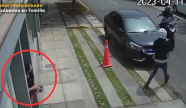 En ese mismo momento, dos sujetos armados a bordo de una moto lineal llegan donde ella estaba. Uno desciende y la encañona quitándole todo lo que traía, mientras que el otro amenaza al conductor del vehículo negro que esperaba a la joven. Tras varios segundos de terror, los delincuentes huyen con lo robado.