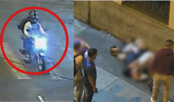 De pronto, otro video muestra que una motocicleta en la que van dos hombres portando casco para evitar se identificados aparecen en escena por el jirón Chancay. El copiloto hace un gesto con sus manos y luego de unos segundos los peatones empiezan a correr asustados debido al sonido de disparos.