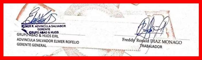 El contrato es firmado entre el exparlamentario y el gerente general de Grupo Abad & Hijos E. I. R. L., Elmer Rofelio Advíncula Salvador, un contador que también pertenece a la región de Pasco, provincia natal de Freddy Díaz.