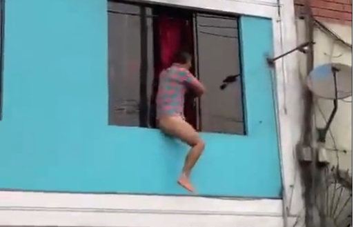 Un video que se ha convertido en viral en las redes sociales muestra a un hombre semidesnudo que se lanzó desde el segundo piso de un hostal para salir corriendo despavorido, al parecer, huyendo de alguna persona. El hecho se registró ayer 14 de febrero a la altura de la cuadra cuatro de la avenida Los Héroes, en San Juan de Miraflores.