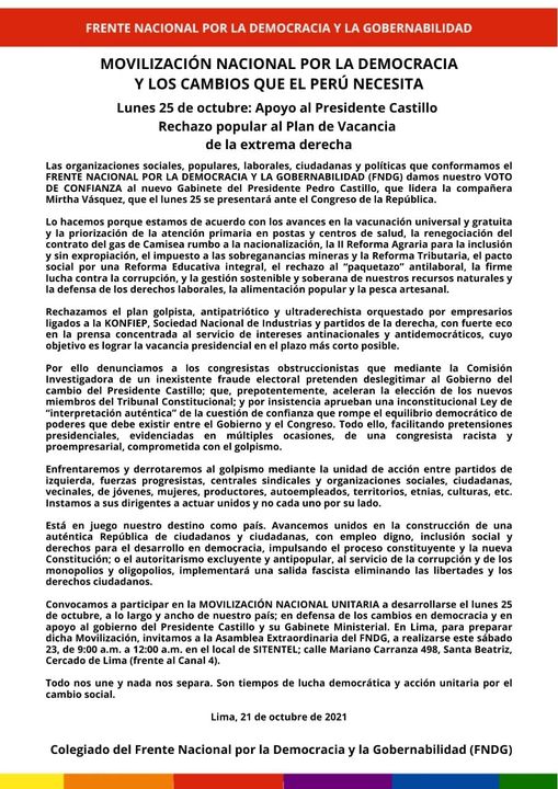 Diferentes organizaciones afialiadas al Frente Nacional por la Democracia y la Gobernabilidad (FNDG) revelaron que realizarán una marcha pacífica este lunes 25 de octubre, a favor del voto de confianza del Gabinete Ministerial comandado por la premier Mirtha Vásquez, que coincidentemente su presentación en el Congreso será el mismo día.