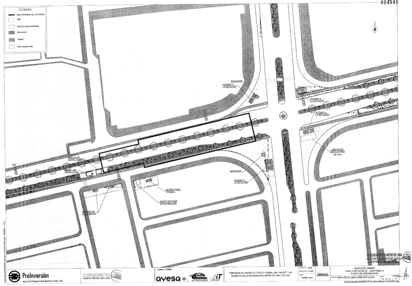 En cruce de avs. O.R. Benavides y Juan Pablo II. Cuatro accesos, que también serán cruceros peatonales subterráneos para esas avenidas. En el lado norte de Benavides habrá dos: uno al oeste de Juan Pablo II (con escalera fija) y otro a su este (con escaleras fija y mecánica). En el lado sur de Benavides habrá otros dos: uno al oeste de Juan Pablo II (con una escalera fija y dos mecánicas) y otro a su este (con escalera fija). Dos elevadores al oeste de Juan Pablo II: uno al sur de Benavides y otro al norte. Dos salidas de emergencia al sur de Benavides, entre calles Arrieta y Noguera. Un bicicletario en cruce de ambas avenidas.