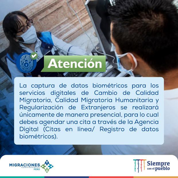 La Superintendencia Nacional de Migraciones, organismo adscrito al Ministerio del Interior (Mininter), informó mediante un comunicado que la captura de datos biométricos para extranjeros que realicen diversos trámites será únicamente presencial.