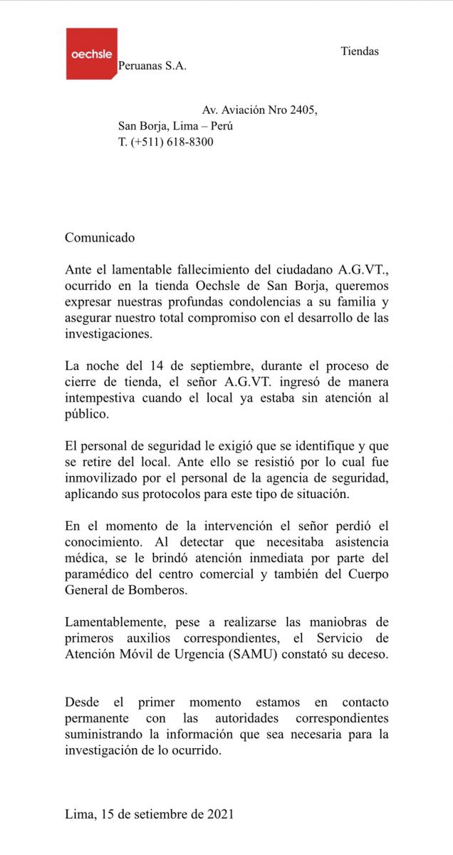 Tras la muerte del cliente Alex Gensollen Vera Tudela (38) ocurrido dentro de la tienda por departamento Oechsle en el centro comercial Real Plaza Primavera, la referida firma, a través de un comunicado, señaló que el personal de seguridad lo inmovilizó tras resistirse a identificarse y a retirarse del local, luego el señor habría perdido el conocimiento.