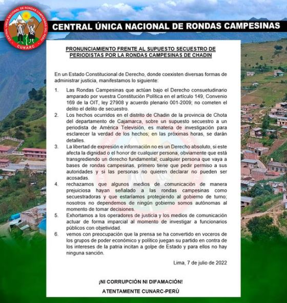 La Central Única Nacional de Rondas Campesinas del Perú (Cunarc) se pronunció tras el supuesto secuestro del periodista de Cuarto Poder, Eduardo Quispe, y su camarógrafo por parte de las rondas campesinas del distrito de Chadín, en Cajamarca, cuando realizaban investigaciones sobre el caso de la cuñada del presidente Pedro Castillo, Yenifer Paredes.