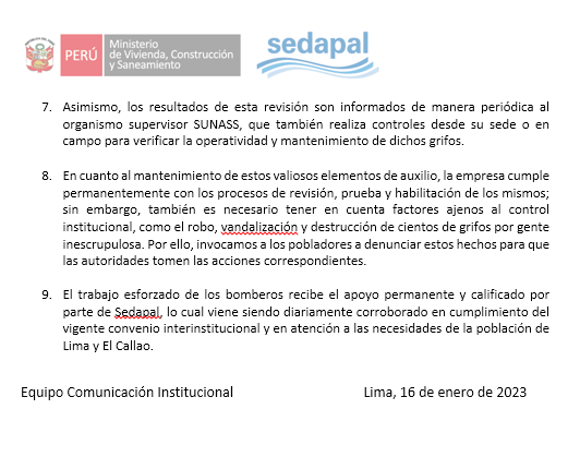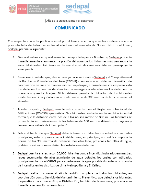 "Sedapal cuenta a la fecha con 20,000 hidrantes contra incendios instalados en nuestras redes secundarias de abastecimiento de agua potable, los cuales son utilizados principalmente por el CGBVP para abastecerse de agua potable durante la ocurrencia de incendios en los distritos de Lima Metropolitana y El Callao", añadió en su comunicado.