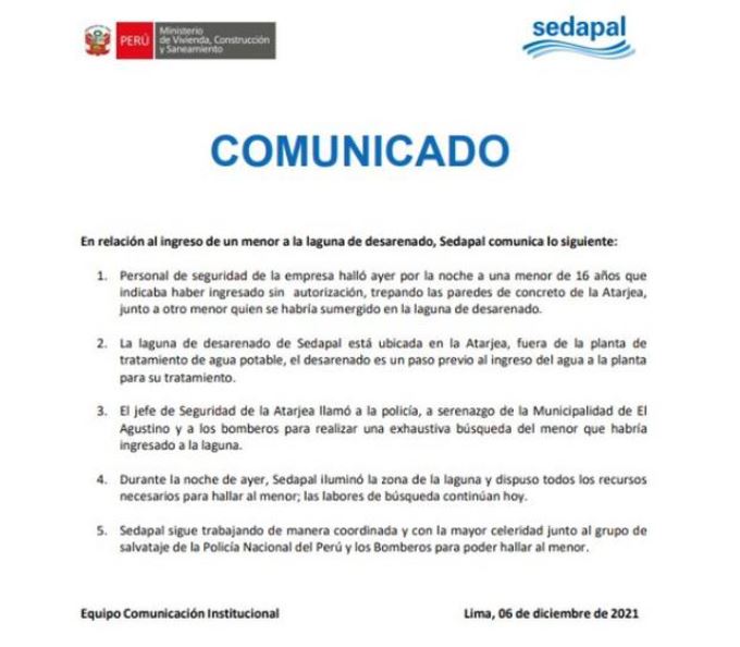Tras lo ocurrido, Sedapal sacó un comunicado en sus redes sociales, donde informó los recursos que están abarcando para encontrar al niño desaparecido.
