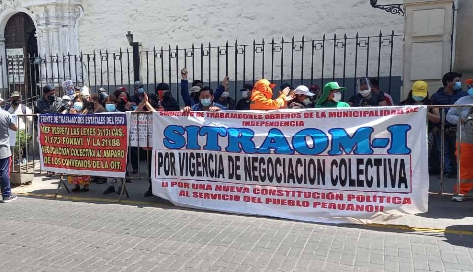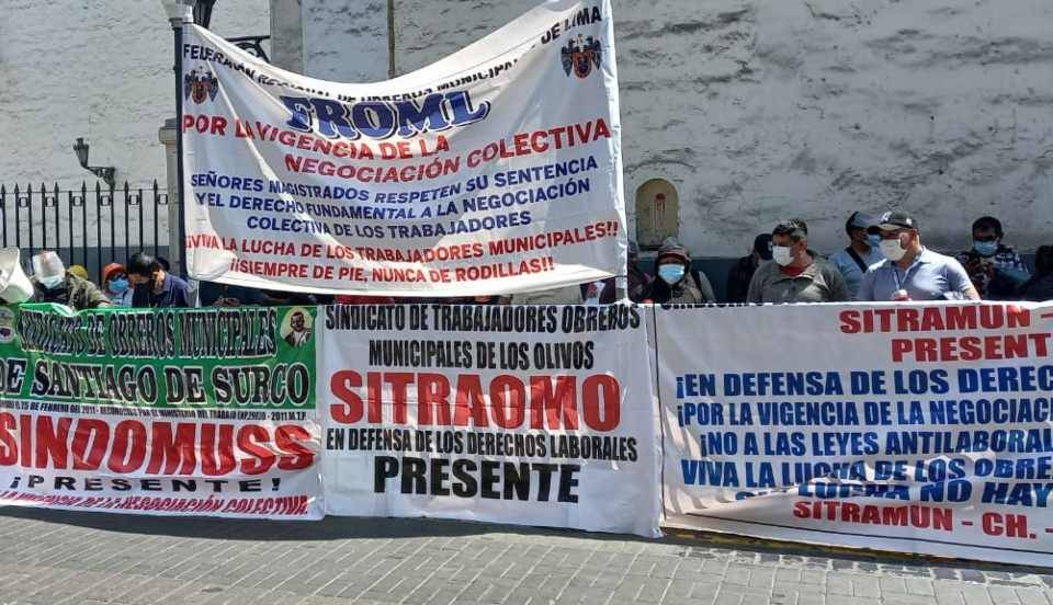 Este miércoles, el Sindicato de Obreros Municipales de Los Olivos, Surco e Independencia, el Frente de Trabajadores Estatales del Perú y el Sindicato Nacional de Enfermeras del Seguro Social de Salud (EsSalud) se encuentran realizando una protesta en los exteriores del Tribunal Constitucional (TC).