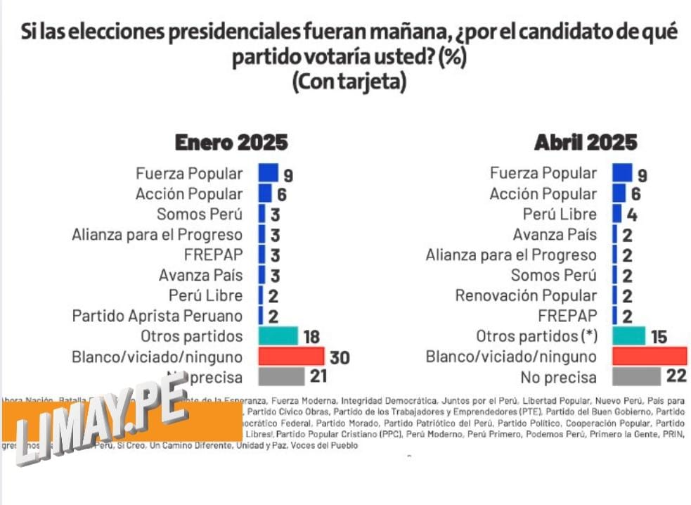 Por otro lado, la intención de voto por partidos políticos muestra un escenario diferente. Fuerza Popular se mantiene como la agrupación más preferida con un 9%, seguida por Acción Popular (6%) y Perú Libre (4%), este último desplazando a Somos Perú del tercer lugar.