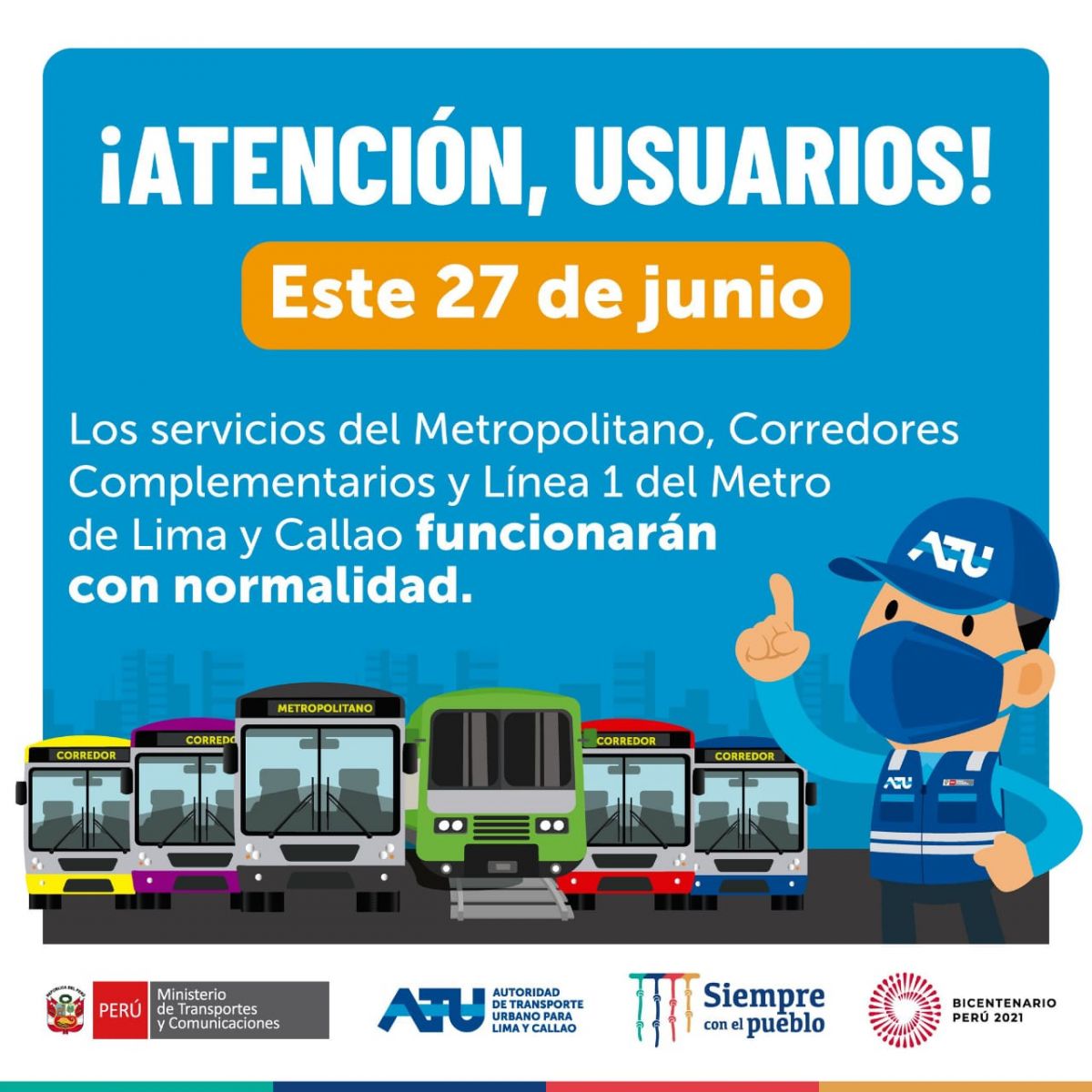 A través de las redes sociales, el Ministerio de Transportes y Comunicaciones (MTC) informó a los usuarios que el 27 y 28 los servicios del Metropolitano, Corredores complementarios y Línea 1 del Metro de Lima y Callao funcionarán con normalidad.