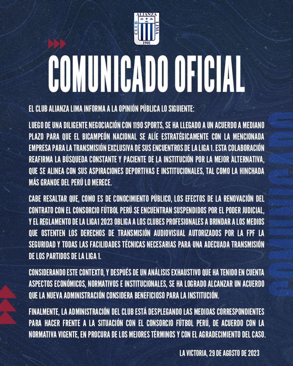 “Luego de una diligente negociación con 1190 Sports, se ha llegado a un acuerdo a mediano plazo para que el bicampeón nacional se alíe estratégicamente con la mencionada empresa para la transmisión exclusiva de sus encuentros de la Liga 1”, señalaron.