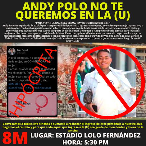 “¡ANDY POLO, NO TE QUEREMOS EN LA U!”, indicó el tuit Universitario Feminista. “Rechazamos tu ingreso a nuestro club, no queremos jugadores que sigan perpetuando su violencia machista a mujeres. Para nosotras esta contratación es una burla para todas las mujeres, pero sobre todo para las hinchas de la U”, completó.