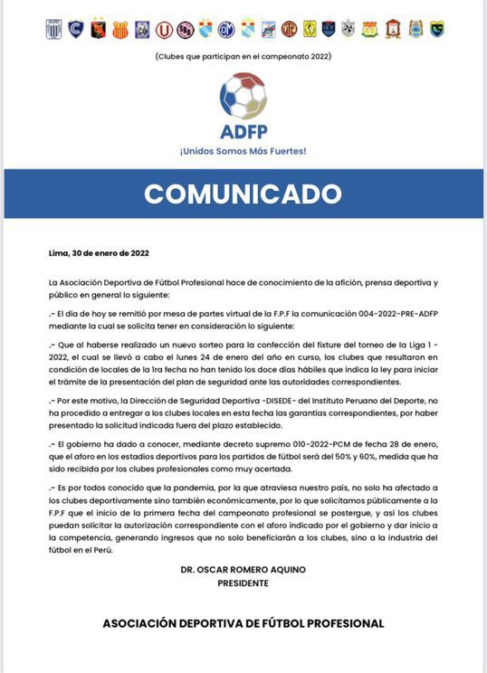Por ello, y para que no se vean más perjudicados, en el comunicado se menciona los siguiente: “Solicitamos públicamente a la FPF que el inicio de la primera fecha del campeonato profesional se postergue, y así los clubes puedan solicitar la autorización correspondiente con el aforo indicado por el Gobierno y dar inicio a la competencia, generando ingresos que no solo beneficiarán a los clubes, sino a la industria del fútbol en el Perú”, finaliza.