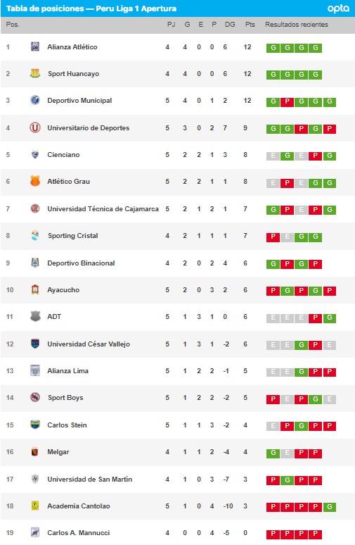 Tras jugarse la fecha 5 de la Liga 1, así quedó la tabla de posiciones. Universitario luchó para llegar al primer lugar del torneo, pero no pudo en su visita a Villa El Salvador. Sporting Cristal, por su parte, se quedó con los tres puntos de la fecha, tras ganar por 1-0 a Alianza Lima en Matute. Alejandro Hohberg marcó el único tanto del compromiso.