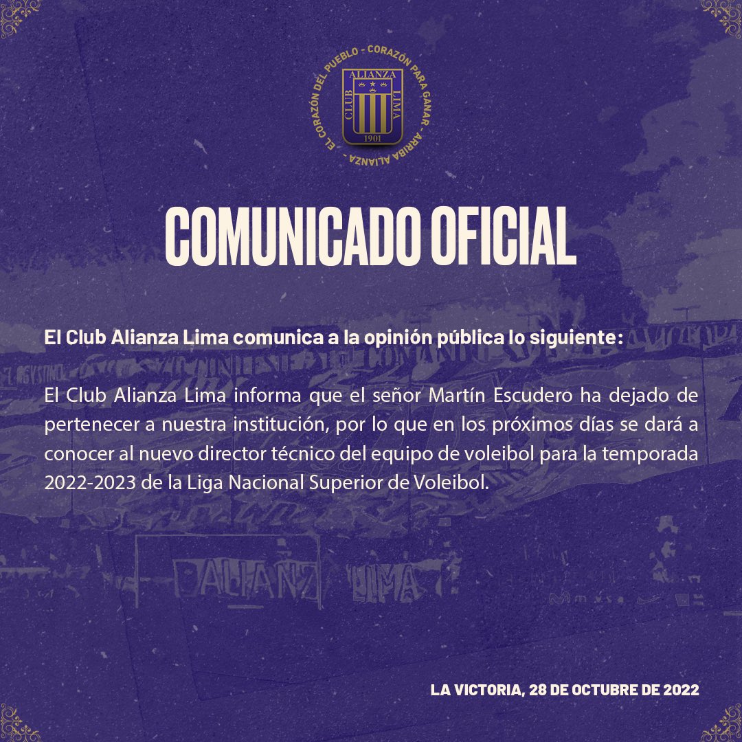 “El Club Alianza Lima informa que el señor Martín Escudero ha dejado de pertenecer a nuestra institución, por lo que en los próximos días se dará a conocer al nuevo director técnico del equipo de voleibol para la temporada 2022-2023 de la Liga Nacional Superior de Voleibol”, se lee en el comunicado de la institución ‘Íntima’.