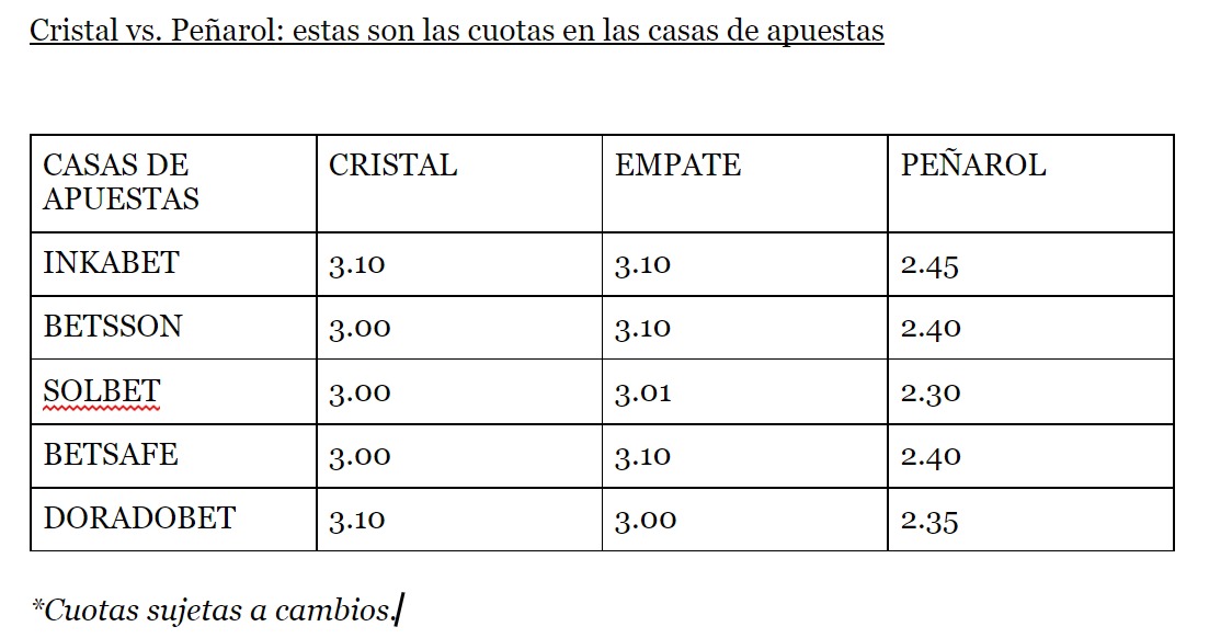 El conjunto charrúa es el favorito para las casas de apuestas nacionales. Solbet, por ejemplo, paga 2.84 la victoria del equipo peruano, mientras que 2.33 paga un triunfo de Peñarol. El empate otorga 3.13 lo apostado.