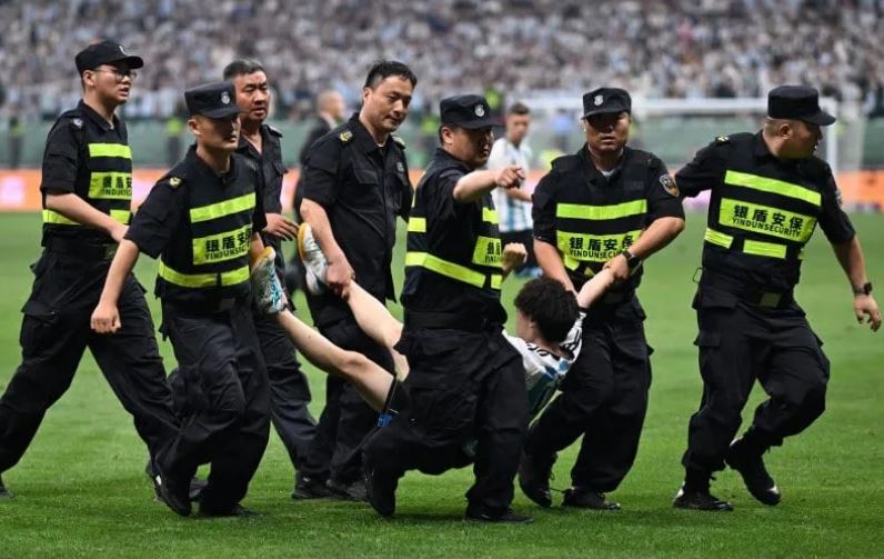 Durante el partido amistoso entre Argentina y Australia, en el que los albicelestes ganaron por 2 – 0, un hincha chino se metió a la cancha en medio del encuentro y fue directo a Lionel Messi para abrazarlo, aunque luego fue detenido por la policía y lo sacaron a la fuerza.