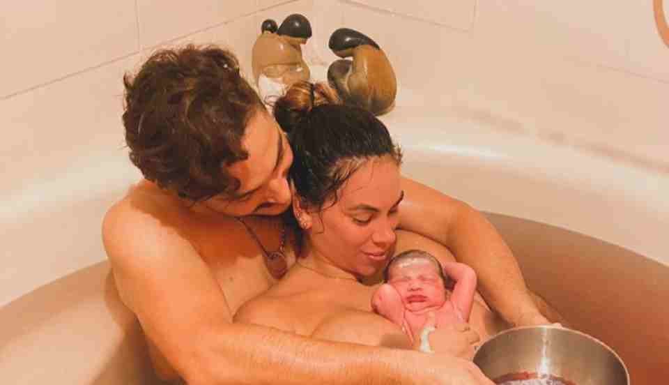 Su esposo también la acompaña dentro del jacuzzi que fue acondicionado para que Aída traiga al mundo a su bebé, incluso el orgulloso padre muestra bastante contento la placenta y parte del cordón umbilical que unía a la bebé y a la modelo.