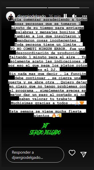 Tras ello, al parecer, el joven artista no soportó más este tipo de tratos y decidió renunciar. Pero antes dejó unos mensajes en Instagram explicando el porqué de su decisión.