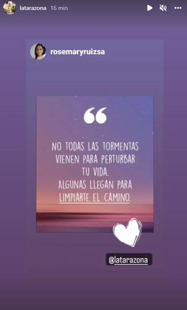 “No todas las tormentas vienen a perturbar tu vida, algunas llegar para limpiarte el camino”, reposteó la también locutora radial en sus historias de Instagram, en referencia a término de su relación Rafael Fernández.