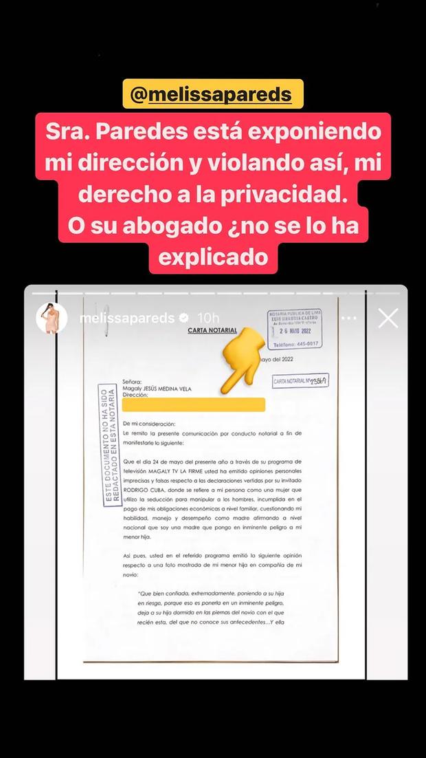 Ante ello, Magaly compartió una captura de pantalla del Instagram de Melissa Paredes, quien publicó la carta notarial que le envió y no ocultó la dirección de la casa de la periodista de espectáculos.