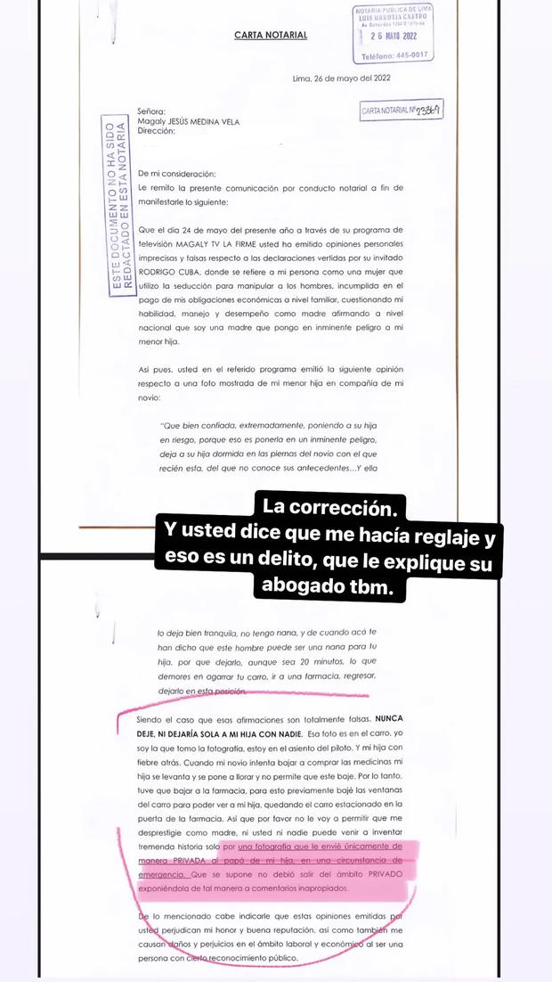 Por su parte, la también actriz procedió a eliminar dicha publicación y compartió por segunda vez la carta notarial, pero esta vez ocultando la dirección de Magaly Medina.