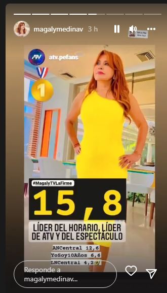 “Líder del horario, líder de ATV y del espectáculo”, publicó Medina en sus historias.