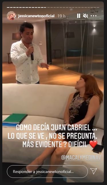 “En un momento en el que no se pueden dar serenatas, feliz de publicarlo... El amor nos hace sonreír a todos... Como decía Juan Gabriel, lo que se ve no se pregunta ¿Más evidente? Difícil...”, continuó Jessica Newton.