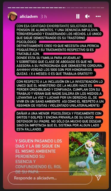 "Con esa cantidad exorbitante solicitada de pensión de alimentos, y una denuncia impulsiva, tergiversando y exagerando los hechos, lo único que sigue demostrando es su trastorno psicológico", escribió Alicia Díaz en su Instagram.