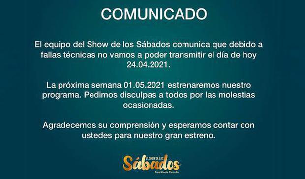 “La próxima semana 01.5.2021 estrenaremos nuestro programa. Pedimos disculpas a todos por las molestias ocasionadas”, postearon en la red social.