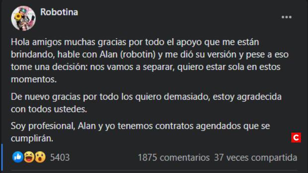 “Hola amigos, muchas gracias por todo el apoyo que me están brindando. Hablé con Alan (Robotín) y me dio su versión, pese a eso tomé una decisión: nos vamos a separar, quiero estar sola en estos momentos”, comentó a través de su página oficial de Facebook.