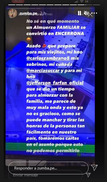 "Asado que preparé para mis viejitos, mi hermano Carlos Zambrano, mis sobrinos, mi cuñada, y para mi hermano Jefferson Farfán que se dio un tiempo para almorzar con la familia", agregó en una historia de su cuenta de Instagram.