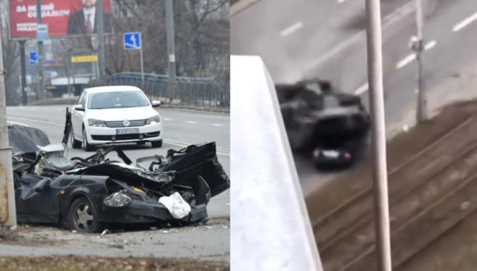 Resulta que un tanque blindado embiste a un auto particular que circulaba por una vía vacía. Un ciudadano logró filmar las imágenes desde lo alto de una ventana.