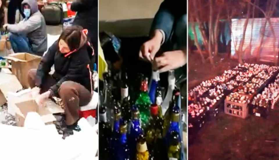 En las imágenes difundidas en Twitter y en medios de comunicación internacional se pueden ver a los ciudadanos preparando estas armas improvisadas y colocando espuma de poliestireno rallado en cientos de botellas.