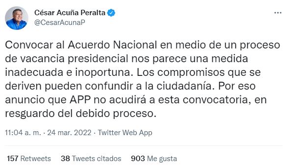 “Convocar al Acuerdo Nacional en medio de un proceso de vacancia presidencial nos parece una medida inadecuada e inoportuna. Los compromisos que se deriven pueden confundir a la ciudadanía. Por eso anuncio que APP no acudirá a esta convocatoria, en resguardo del debido proceso”, escribió en su cuenta de Twitter.
