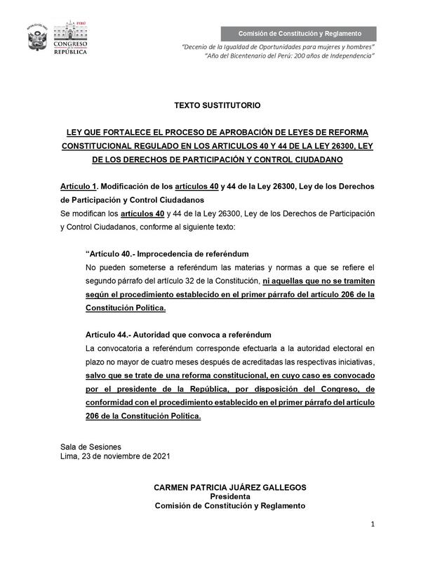 La Comisión de Constitución y Reglamento aprobó, con 11 votos a favor, 6 en contra y 1 abstención, el texto de un proyecto de ley que establece que toda reforma constitucional deba ser aprobada primero por el Congreso antes de ser sometida a un referéndum.