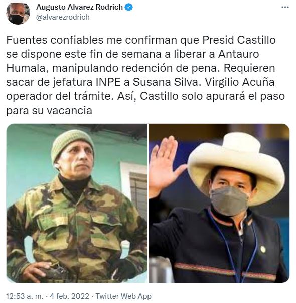 Asimismo, el periodista Augusto Alvarez Rodrich aseguró que le confirmaron que el presidente Pedro Castillo “se dispone este fin de semana a liberar a Antauro Humala, manipulando redención de pena. Requieren sacar de jefatura INPE a Susana Silva. Virgilio Acuña operador del trámite. Así, Castillo solo apurará el paso para su vacancia”.