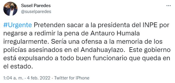 “Pretenden sacar a la presidenta del INPE por negarse a redimir la pena de Antauro Humala irregularmente. Sería una ofensa a la memoria de los policías asesinados en el Andahuaylazo. Este gobierno está expulsando a todo buen funcionario que queda en el Estado”, escribió Paredes.