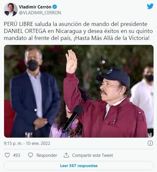 “Perú Libre saluda la asunción de mando del presidente Daniel Ortega en Nicaragua y desea éxitos en su quinto mandato al frente del país”, escribió Cerrón Rojas en su cuenta de Twitter.