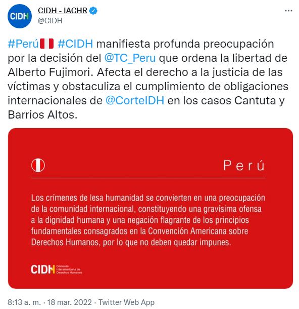 “La CIDH manifiesta profunda preocupación por la decisión del Tribunal Constitucional que ordena la libertad de Alberto Fujimori. Afecta el derecho a la justicia de las víctimas y obstaculiza el cumplimiento de obligaciones internacionales de La Corte IDH en los casos Cantuta y Barrios Altos”, expresaron en Twitter.