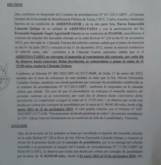 En el Informe 037-2022 el asesor jurídico dice que la entidad debe “emplazar mediante carta notarial a la señora Nieves Limachi a fin de que proceda con el pago, en su defecto se proceda a realizar las acciones legales para el cobro”. El informe está dirigido al gerente general de la Beneficencia Helar Neyra Torres. Se desconoce si ahora sí le notificaron a la parlamentaria.