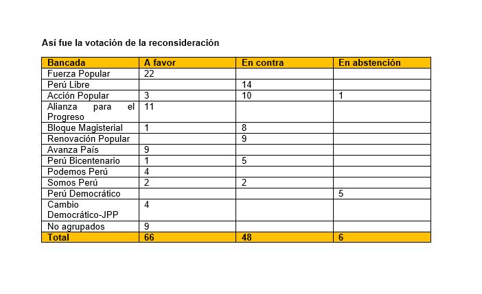 El último sábado durante la madrugada, en el Congreso se rechazó que las elecciones se adelanten para este año, sin embargo, esta vez recapacitaron, pues el Pleno aprobó con 66 votos a favor, reconsiderar que los comicios se realicen en octubre de este año. Es decir, volverán a debatir esta propuesta para votar si finalmente es aprobada o no.