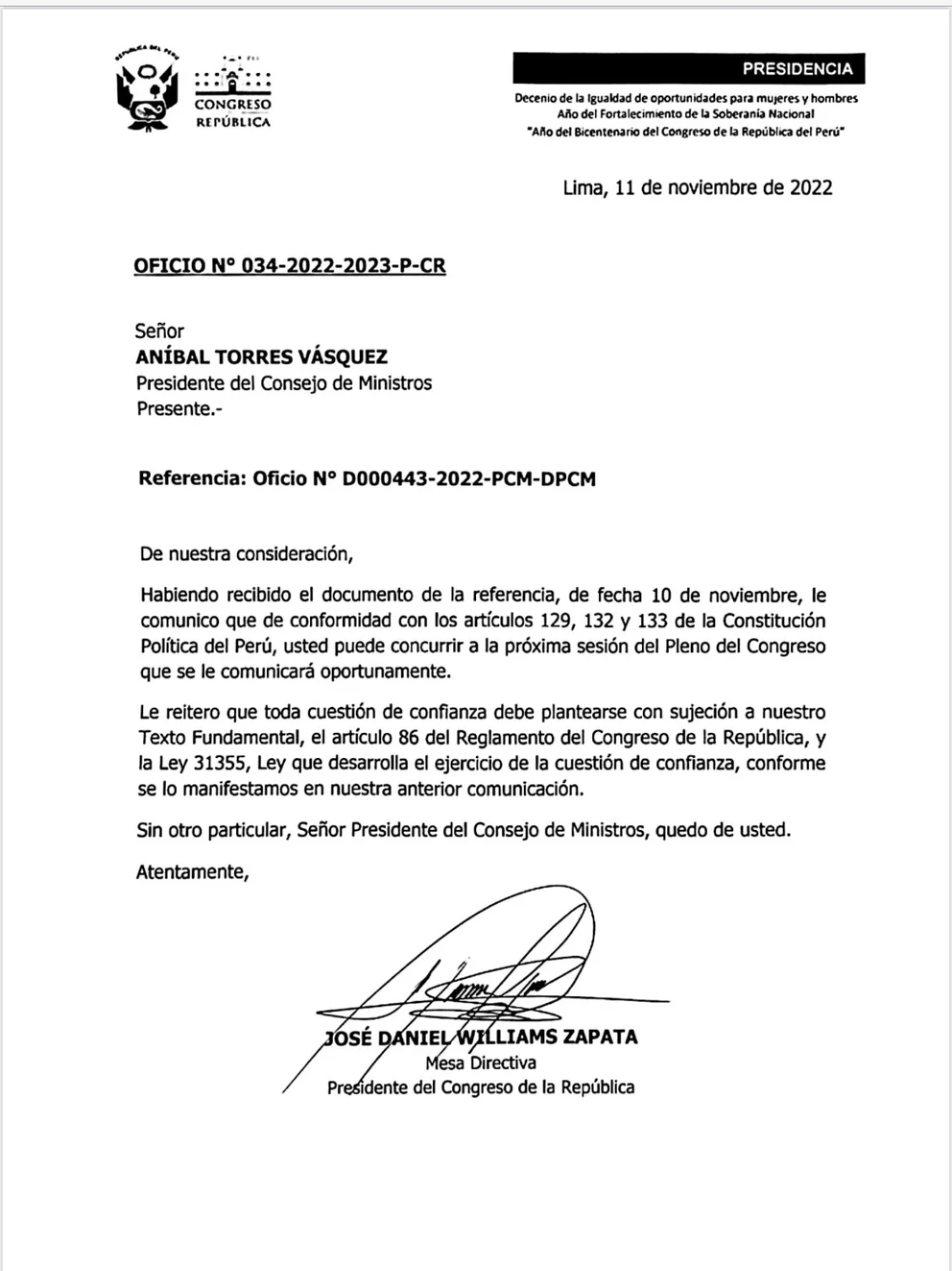 Mediante un oficio de José Williams, presidente del Congreso de la República, dirigido al presidente del Consejo de Ministros, Aníbal Torres Vásquez, dio respuesta al pedido del Ejecutivo para presentar cuestión de confianza.