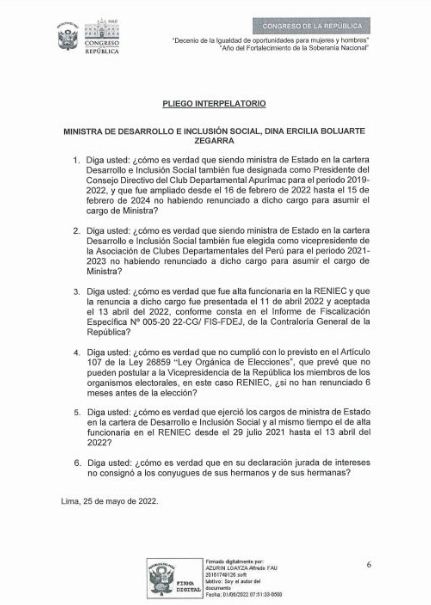 El documento que fue presentado en mesa de partes del Congreso, lleva las firmas de los congresistas de APP, Avanza País, Somos Perú y del Partido Morado. Según dicho documento, Dina Boluarte deberá responder poco más de seis preguntas respecto al tema de por qué no renunció a su cargo dentro del mencionado club privado cuando ya ejercía como ministra.
