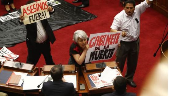 Según las imágenes, los congresistas del Bloque Magisterial y Perú Libre sacaron varias pancartas en medio del Hemiciclo con fuertes frases donde piden la renuncia del Gabinete, además de calificarlos como homicidas y hasta de tildarlos como "Gabinete de la muerte", esto debido a las 17 muertes ocurridas ayer en Juliaca.